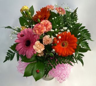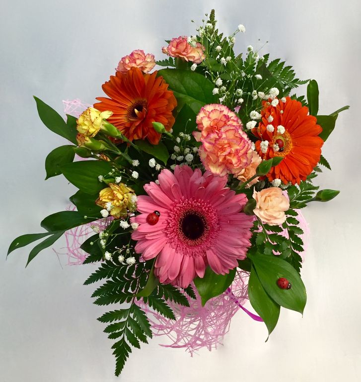 хит Сборный букет # 2 006 2690 руб. В корзину Состав Герберы (разноцветные): 3 Гвоздики (кустовые): 4 Рускус, папоротник: 3 Оформление Сизаль (розовая) Лента Декор "Божьи коровки": 3 Состав Герберы (разноцветные): 3 Гвоздики (кустовые): 4 Рускус, папоротник: 3 Оформление Сизаль (розовая) Лента Декор "Божьи коровки": 3