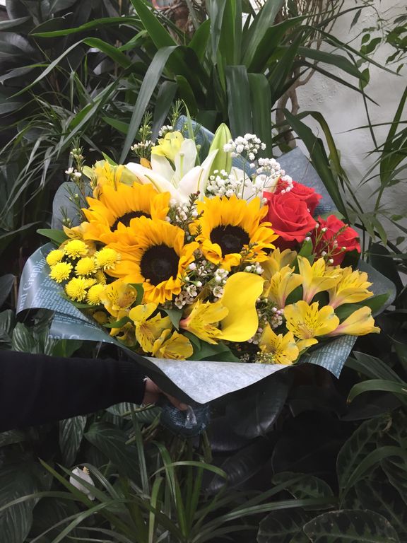 хит Сборный букет # 2 050 7790 руб. можно купить в кредит В корзину Состав Подсолнухи: 3 Розы «Нина»: 3 Альстромерии (желтые): 3 Лилия: 1 Мимоза или Гипсофила: 1 Каллы: 3 Состав Подсолнухи: 3 Розы «Нина»: 3 Альстромерии (желтые): 3 Лилия: 1 Мимоза или Гипсофила: 1 Каллы: 3