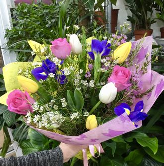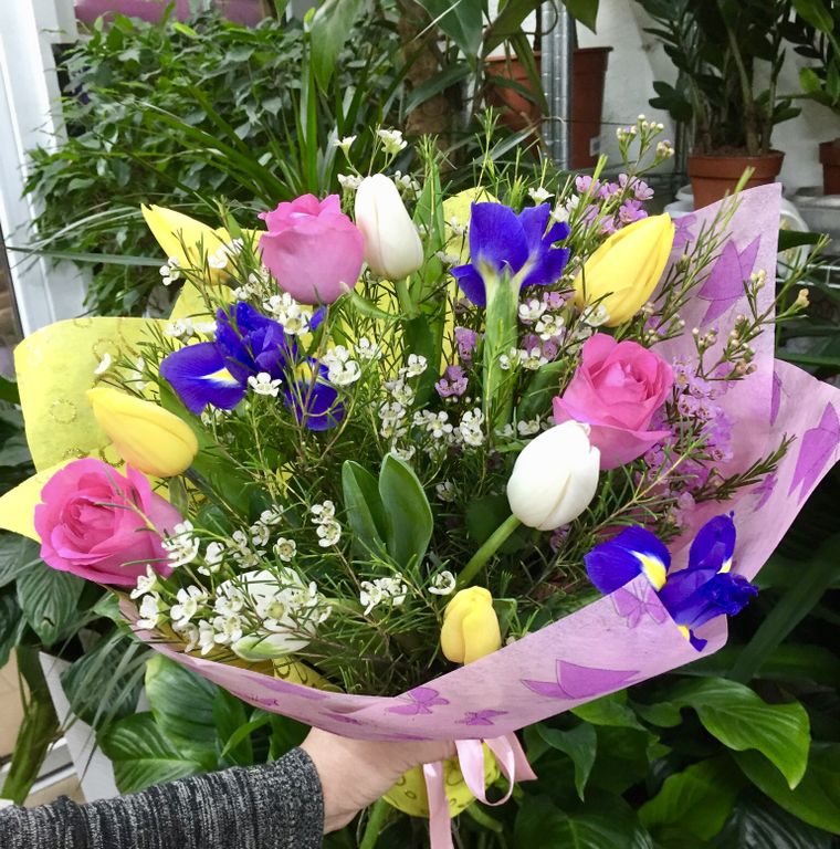 Сборный букет # 2 053 4390 руб. можно купить в кредит В корзину Состав Розы (розовые): 3 Ирисы: 5 Тюльпаны (желтые, белые): 6 Оформление Гипсофила Мимоза Фетр (розовый) Лента Состав Розы (розовые): 3 Ирисы: 5 Тюльпаны (желтые, белые): 6 Оформление Гипсофила Мимоза Фетр (розовый) Лента