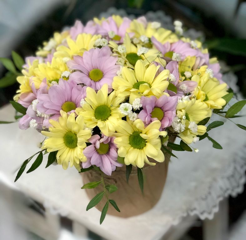 Цветочная композиция # 10 005 2590 руб. В корзину Состав Хризантемы (кустовые) Гипсофила Эвкалипт Кашпо Оформление Крафт бумага Состав Хризантемы (кустовые) Гипсофила Эвкалипт Кашпо Оформление Крафт бумага