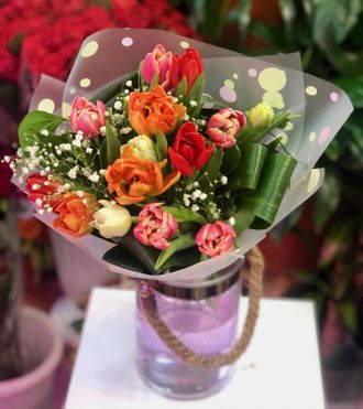 Букет из тюльпанов # 5 006 4190 руб. можно купить в кредит В корзину Состав Тюльпаны пионовидные (микс): 15 Гипсофила: 1 Оформление Корейская пленка Лента Состав Тюльпаны пионовидные (микс): 15 Гипсофила: 1 Оформление Корейская пленка Лента