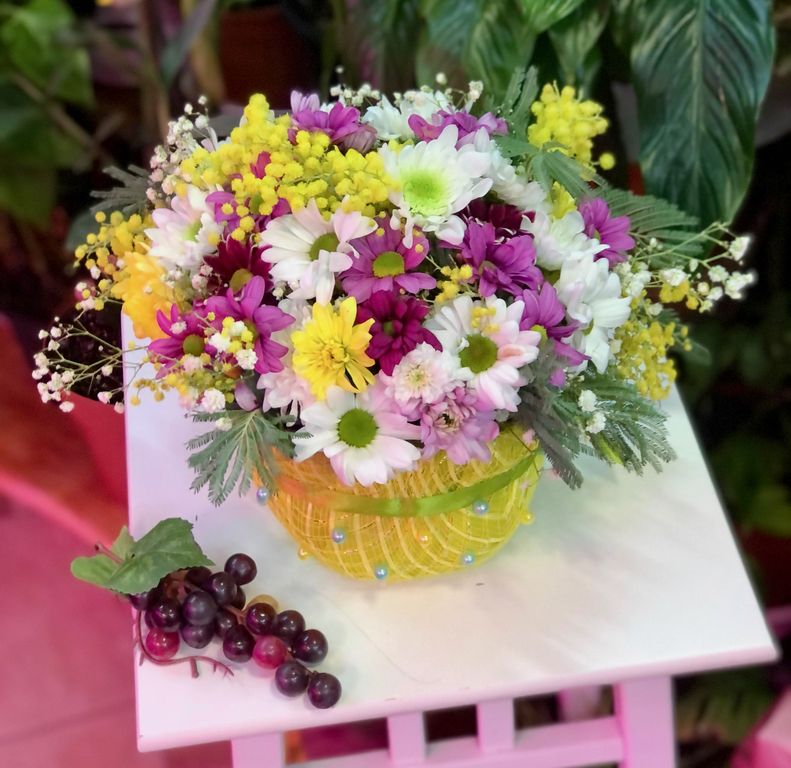 Цветочная композиция # 10 013 4190 руб. можно купить в кредит В корзину Состав Кустовые хризантемы (микс) Мимоза Шамелациум Оформление Сетка Лента Состав Кустовые хризантемы (микс) Мимоза Шамелациум Оформление Сетка Лента