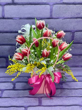 Цветы в сумке #18 006 3790 руб. можно купить в кредит В корзину Состав Тюльпаны: 13 Мимоза: 1 Рускус: 5 Фисташка: 1 Оформление Сумочка Оазис Бант Состав Тюльпаны: 13 Мимоза: 1 Рускус: 5 Фисташка: 1 Оформление Сумочка Оазис Бант